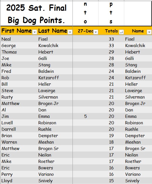| Big Dogs for (Wednesdays 2019) rev: 10/30/2019 Final | Points |